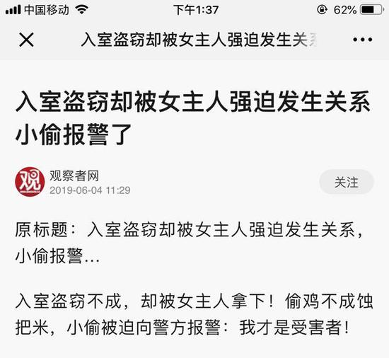 近日,一则“入室盗窃,却被女主人强迫发生关系!小偷被迫选择报警”的消息,在网络上流传。