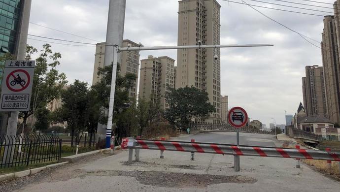 东侧,花桥与安亭以河道“顾浦”为界,顾浦上,一条长约三四十米、宽十余米的“车城桥”联通了两侧的新东路和博园路。解放日报·上观新闻记者在现场看到,车城桥的两端桥头处,均竖起了间隔1米的铁桩路障。西侧桥头处,除了根根路障外,还额外横着一根几乎与桥面等宽的铁杆子,再加上一个禁止机动车通行的圆形标志。原本连通的新东路和博园路,就此隔断。阻隔之下,花桥方向过来不少挂着“沪c”车牌的车辆,只能在近西端桥头处改道向北,从兆丰路一路走至曹安公路,才能再向东进入上海,这正是辛先生所说的“向北绕个大圈”。不过,路障间留有了够非机动车和人行通行的宽度,记者赶到现场时正值近中午时分,桥上不少骑着电瓶车的送餐员和推着小车、拎着菜的居民来来往往。