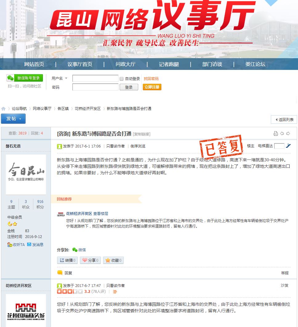 △“昆山网络议事厅”网站上,花桥经济开发区解释了车城桥花桥侧设立路障的原因。