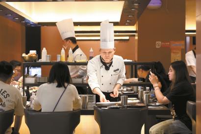 一家日料餐厅内,厨师正为顾客现场烹制食物。 本报记者 李茂君 摄