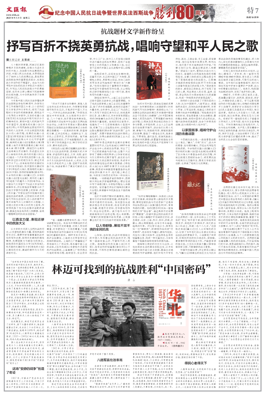 今年是中国人民抗日战争暨世界反法西斯战争胜利80周年,作家和文学工作者胸怀国之大者,以小说和纪实文学等多种文学形式,续写了抗战题材文学创作的崭新篇章,涌现出不少优秀的文学新作。王尧的长篇小说《桃花坞》关注抗战中现代知识分子的精神成长,展现中国人的民族气节与价值坚守。赵德发的长篇小说《大海风》用心书写民族航运家经历时代风浪的人生探索,从实业救国到沉船抗日的心路历程。祝勇的长篇小说《国宝》再现故宫文物南迁的艰险历程,描绘抗战烽火中文化守护者群像。高渊的长篇小说《诺曼底公寓》围绕着上海历史建筑诺曼底公寓(现武康大楼)展开叙事 ,联结四行仓库保卫战等真实历史事件,形成虚实交织的上海城市史诗。路内的长篇小说《山水》描述一个汽车司机的四季人生,他驾车穿过抗日的前方后方,驶过历史的万水千山。还有赵柏田的长篇纪实文学《生死危城》、张庆国的长篇纪实文学《绿色的火焰》、庞瑞垠的长篇小说《补天裂》、房伟的短篇集《猎舌师》、牛余和的长篇小说《蘸火记》、许刚的长篇小说《莹光血痕》、简平的儿童文学《地底下的魔术小天团》等作品,为中国当代文学留下了抗战文学创作的新鲜样本。评论家施战军精要分析了抗战文学新作在叙事上的探索、内涵上的丰富:“作家在创作中挖掘中国人奋起抗战的根源,让团结抗日成为民族气节和生活信仰,在小说的情节中展开英雄气与儿女情的水火相融、人间烟火在抗日烽火中的有力呈现。作家用民族个性与生活情状适配的语韵,塑造出有血有肉的人物群像,呈现一幅幅鲜活的抗战生活画卷。”