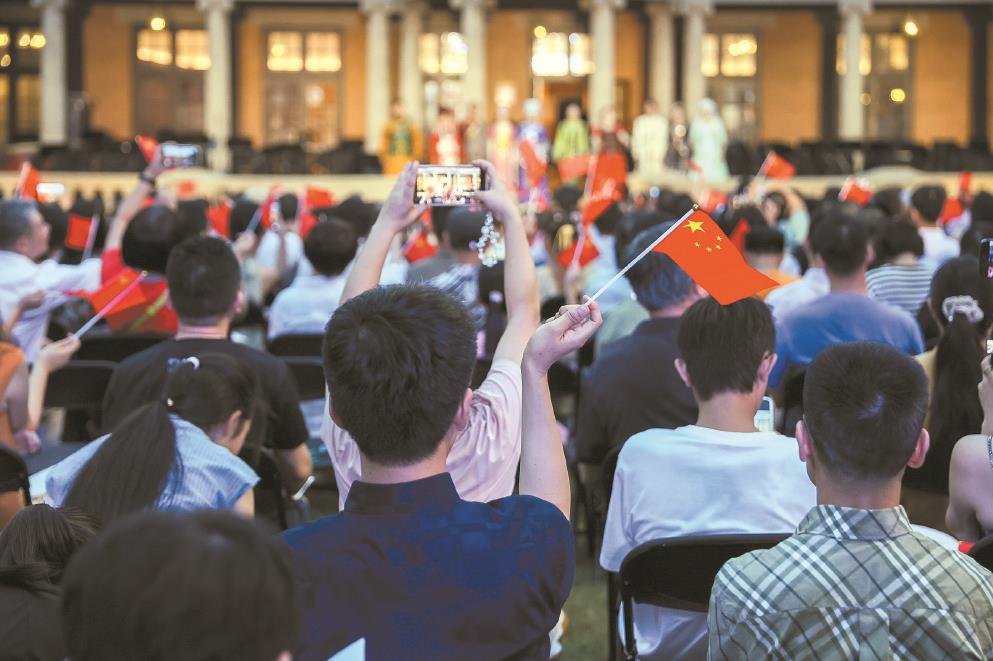 专业演出搬至户外草坪,让校园里的百年建筑与悠扬音符交织。二胡重奏《良宵》以婉转旋律勾勒月夜静谧,让民乐之美自然融入城市秋夜。少数民族学生合唱《爱我中华》《唱支山歌给党听》,唱出各民族像石榴籽一样紧紧抱在一起的凝聚力,也为文旅场景注入多元文化色彩。来自果洛藏族自治州的上音少数民族学生麻切仁措表示:“看到观众席的笑脸,我确信艺术能直抵人心,凝聚各族人民的精神力量。”