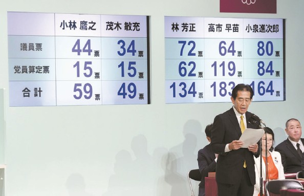 在5名候选人中,以前首相小泉纯一郎的次子小泉进次郎和高市早苗的当选呼声最高。在第一轮选举中,高市早苗和小泉进次郎分别以183票和164票分列第一和第二,进入第二轮决胜投票。在决胜投票中,高市早苗以领先小泉进次郎29票的优势当选自民党新总裁。