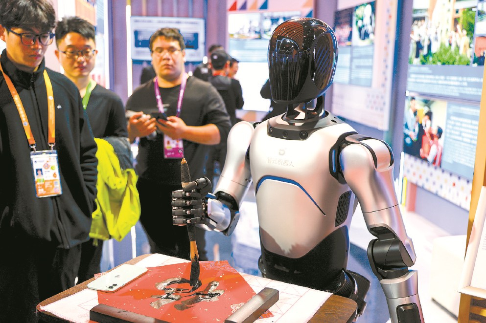 人们在第八届进博会国家展中国馆观看机器人用毛笔写“福”字。新华社图