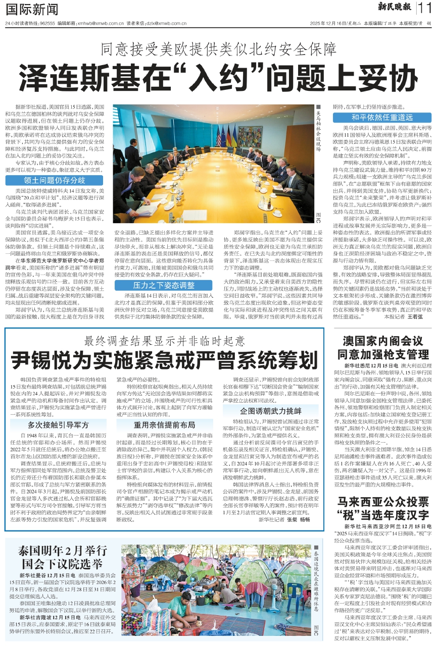 据新华社报道,美国官员15日透露,美国和乌克兰在德国柏林的谈判就对乌安全保障议题取得进展,但在领土问题上仍存分歧。欧洲多国和欧盟领导人同日发表联合声明称,美欧承诺将在达成协议结束俄乌冲突的背景下,共同为乌克兰提供强有力的安全保障和经济复苏支持措施。与此同时,乌克兰在加入北约问题上的妥协引发关注。