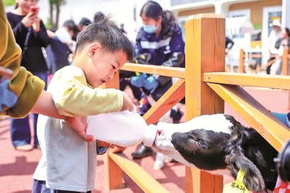 作为光明乳业产业链起点的金山牧场,也以科技与趣味兼具的文旅地标姿态,成为消费者亲近“一杯好奶”诞生地的热门打卡地。在这里,游客可以近距离观察奶牛的生活,了解现代牧场的智能化管理,还能亲手参与饲喂活动。这一融合科普、互动与自然体验的研学空间,如今已成为上海亲子游的“新宠”。