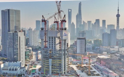 首先是国内首创的“空中工厂”,不断刷新超高层施工效率。上海建工研发的“核心筒—巨柱—通行连廊”一体化的“空中工厂”,高度集成施工升降机、混凝土布料机、钢结构焊接平台等多种施工装备,实现了核心筒与外框巨柱平层竖向结构同步施工。