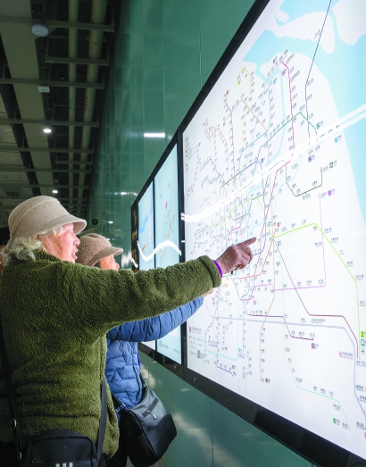 右图:昨天,18号线二期工程开通初期运营。一早,市民在康文路站内了解上海轨交最新运营网线图。本报记者 孟雨涵 摄