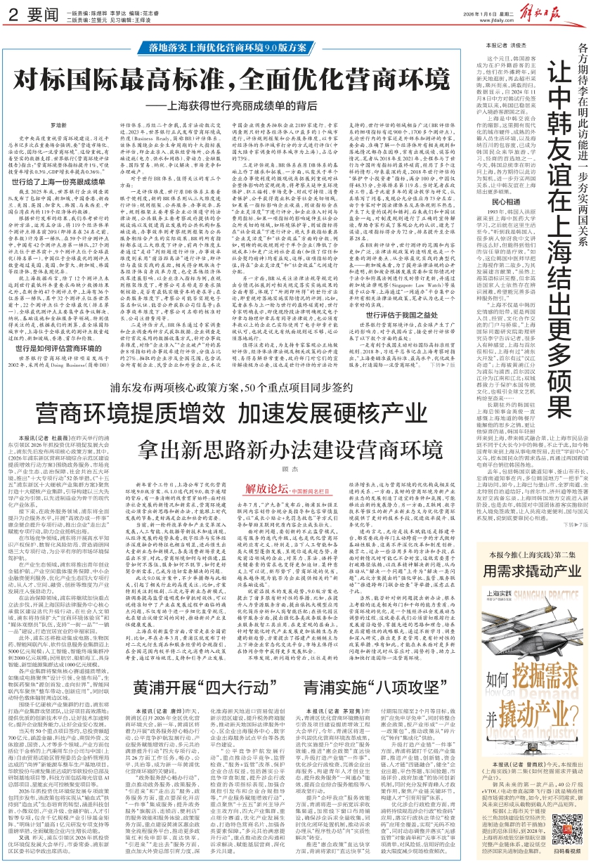 习近平总书记强调:“营商环境没有最好,只有更好。”2026年1月4日,上海召开全市优化营商环境工作大会,发布《上海市加快打造国际一流营商环境行动方案(2026年)》。在借鉴世行评估底层逻辑的基础上,坚持以我为主,自主改、主动改,积极体现上海营商环境实践特点,从四个不同的维度打造良好的营商环境。各维度的价值导向各不相同,体现了政策制定者对营商环境的深刻体察:政务服务环境强调高效便捷,市场竞争环境强调公平公正,产业生态环境强调友好适配,社会共治环境强调多元协同。