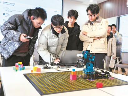 学生操作机器人抓取物块的挑战赛。 资料图片