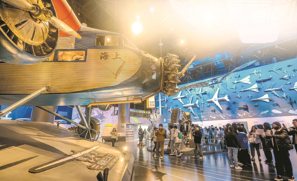 昨天,上海科技馆“飞行探秘”展区内展出的1∶1高仿真复原的5-AT型号福特三发飞机吸引众多参观者。 本报记者 袁婧摄
