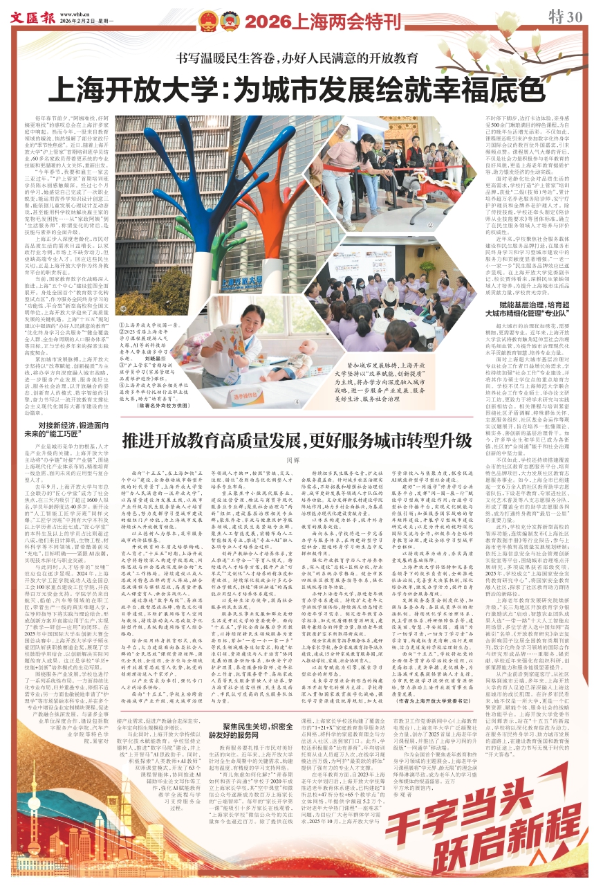 当前,国家教育数字化战略深入推进,上海“五个中心”建设蓝图全面展开。身处全国首个“教育数字化转型试点区”,作为服务全民终身学习的“功能性、平台型”新型高校和全国文明单位,上海开放大学迎来了高质量发展的关键机遇。上海“十五五”规划建议中强调的“办好人民满意的教育”“优化终身学习公共服务”“健全覆盖全人群、全生命周期的人口服务体系”等目标,正与学校多年来的探索实践高度契合。