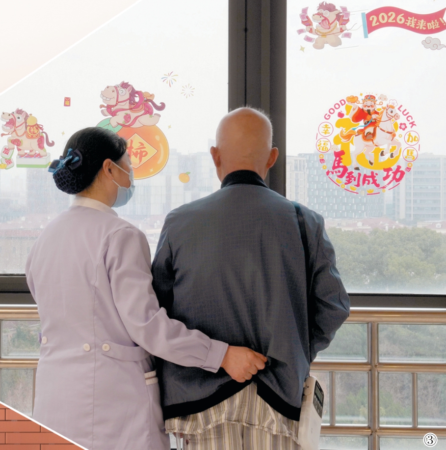 ③在上海市肺科医院外科病区,医疗护理员在辅助病人行走。