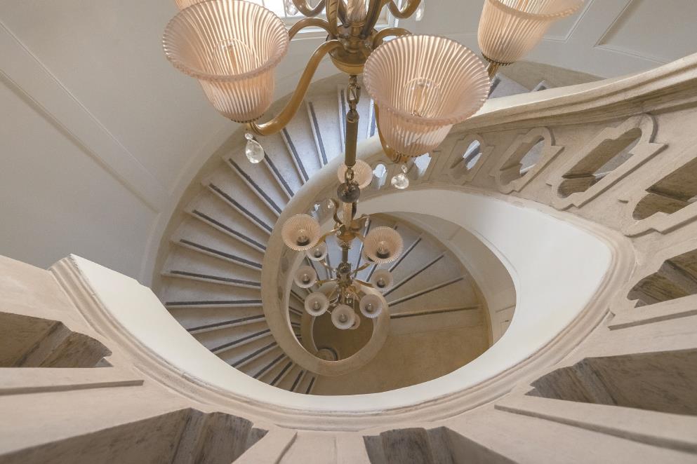 白公馆(现上海沪剧院)灰白色的水刷石外墙在梧桐掩映下泛着珍珠般光泽,室内,贯通三层的弧形主楼梯为异型曲线样式的钢筋混凝土结构,历经岁月洗礼,通体光润、质地细腻,宛如乳白色大理石 (图片由上海沪剧院提供) -