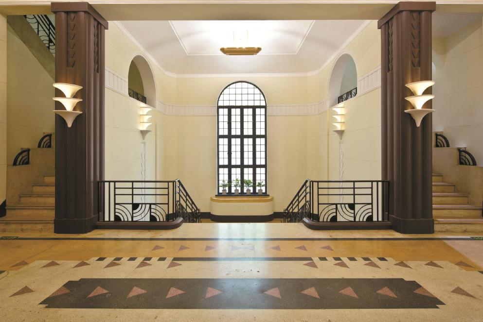 上海昆剧团现址在梧桐成荫的绍兴路,是一座独特的装饰艺术风格的米黄色三层建筑,室内布局及装饰风格摩登气派,最具特色的是异色相拼彩色水磨石楼地坪与具有装饰艺术特征的装饰线脚以及灯具 (图片由上海昆剧团提供) -