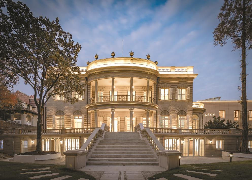 白公馆始建于1919年,由当时上海滩著名的匈牙利建筑师邬达克设计。建筑坐落于法租界核心区,占地约2000平方米,主体为三层砖混结构,采用法国文艺复兴风格,对称式立面搭配弧形阳台与科林斯柱式,窗楣装饰卷草纹样,整体呈现典型的欧洲古典美学。建筑南立面采用典型的横三段纵三段构图:底层以粗犷的仿石砌筑基座奠定稳重基调,二、三层通过爱奥尼柱式与塔斯干柱式的交替使用形成韵律感。建筑外立面采用的“上海批荡”(Shanghai Plaster)工艺,是近代上海工匠的智慧结晶。施工时将宜兴紫砂颗粒与普通石子按7:3比例混合,掺入白水泥分层涂抹,最后用硬毛刷“洗”出石材质感。这种工艺既模拟了欧洲石材的视觉效果,又解决了江南地区潮湿气候导致的石材风化问题。