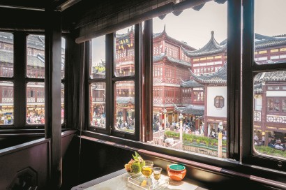 湖心亭二楼的每一扇窗前均有雅座,向外望去,能看见豫园商城的风景。 本报记者 孟雨涵 摄