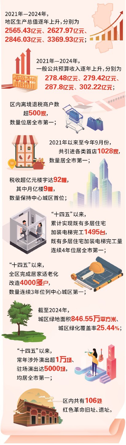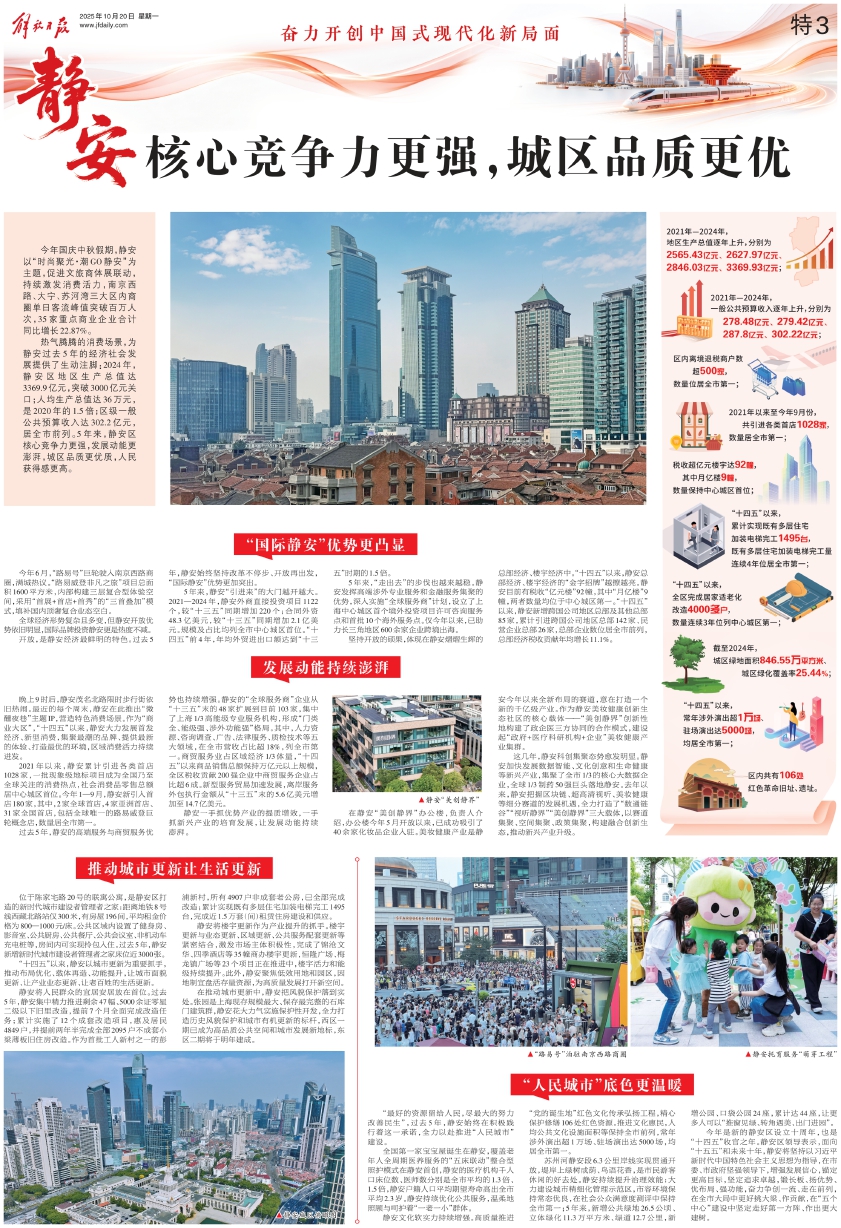 热气腾腾的消费场景,为静安过去5年的经济社会发展提供了生动注脚:2024年,静安区地区生产总值达3369.9亿元,突破3000亿元关口;人均生产总值达36万元,是2020年的1.5倍;区级一般公共预算收入达302.2亿元,居全市前列。5年来,静安区核心竞争力更强,发展动能更澎湃,城区品质更优质,人民获得感更高。