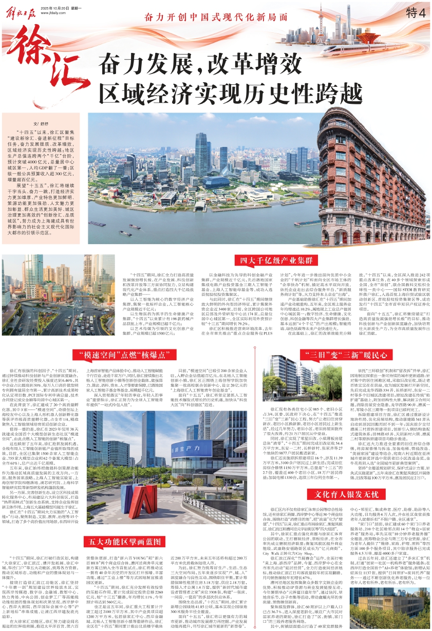 “十四五”以来,徐汇区聚焦“建设新徐汇、奋进新征程”目标任务,奋力发展提质、改革增效,区域经济实现历史性跨越:地区生产总值连跨两个“千亿”台阶,预计突破4000亿元,总量居中心城区第一,人均GDP翻了一番;区级一般公共预算收入超300亿元,增量超百亿元。