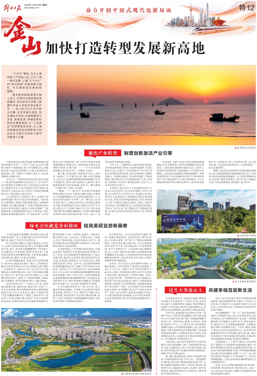 雷克萨斯新能源项目破土动工、水库村水清岸绿的美丽蝶变、华东师范大学第二附属中学金山实验学校全新开学……金山区正以产业升级为引擎、生态改善为底色、民生福祉为目标,加速构建活力宜业、美丽宜游、幸福宜居的转型发展新高地,让“上海湾区”的招牌愈发闪亮,为上海加快建成具有世界影响力的社会主义现代化国际大都市贡献金山力量。