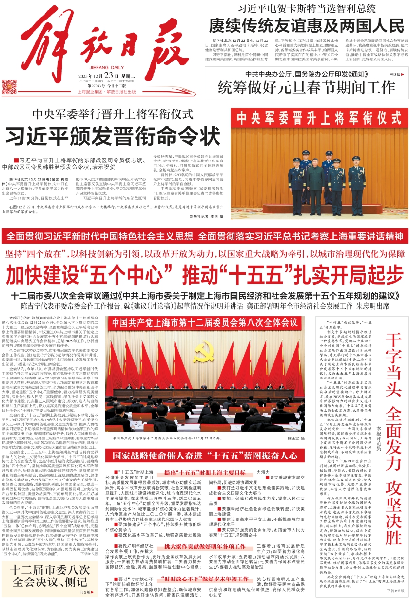 本报讯(记者 张骏)中国共产党上海市第十二届委员会第八次全体会议12月22日召开。全会深入学习贯彻党的二十大和二十届历次全会精神,全面贯彻落实习近平总书记考察上海重要讲话精神,审议通过《中共上海市委关于制定上海市国民经济和社会发展第十五个五年规划的建议》;认真贯彻落实中央经济工作会议精神,总结2025年工作,分析当前形势,部署明年经济社会发展目标任务。