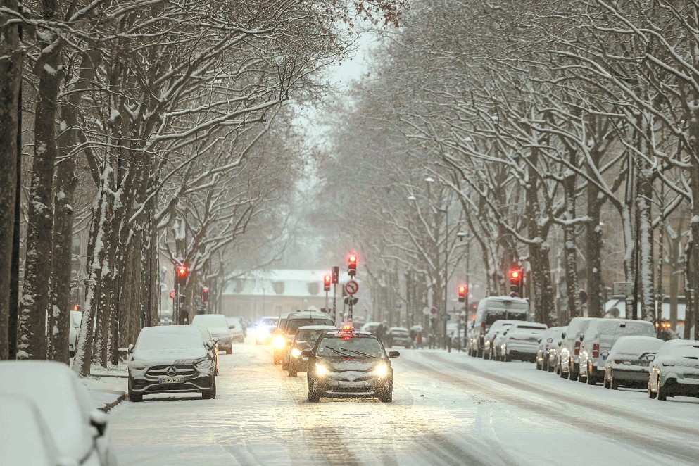 图为1月5日,在法国巴黎,车辆行驶在积雪的街道上。新华社发