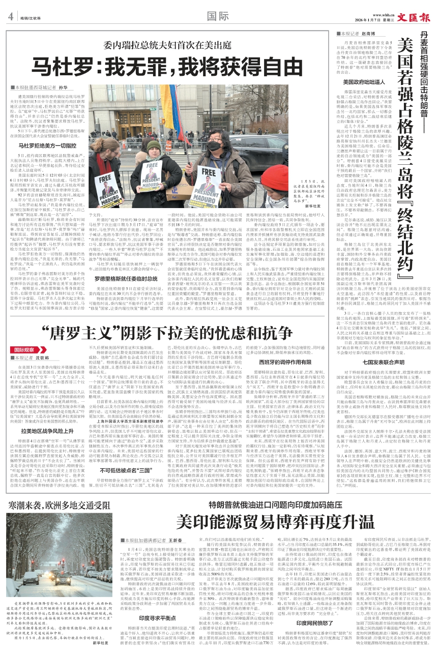 马杜罗拒绝美方一切指控,强调他仍然是委内瑞拉总统。“我是无辜的,我无罪。”马杜罗说,“我是一个正派的人。我仍是我的国家的总统。”