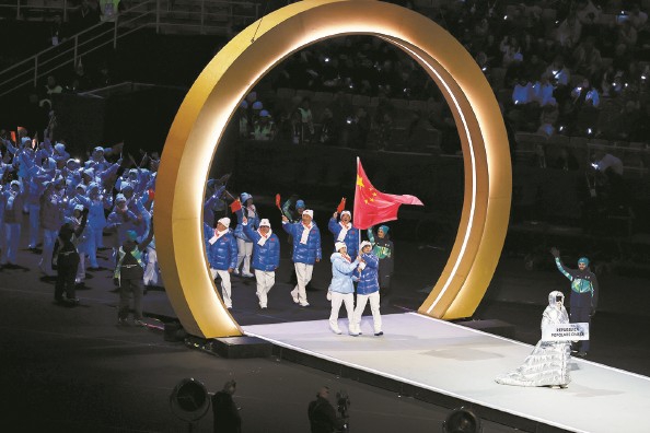中国体育代表团在宁忠岩和张楚桐的引领下入场 本报特约记者 钱俊 摄