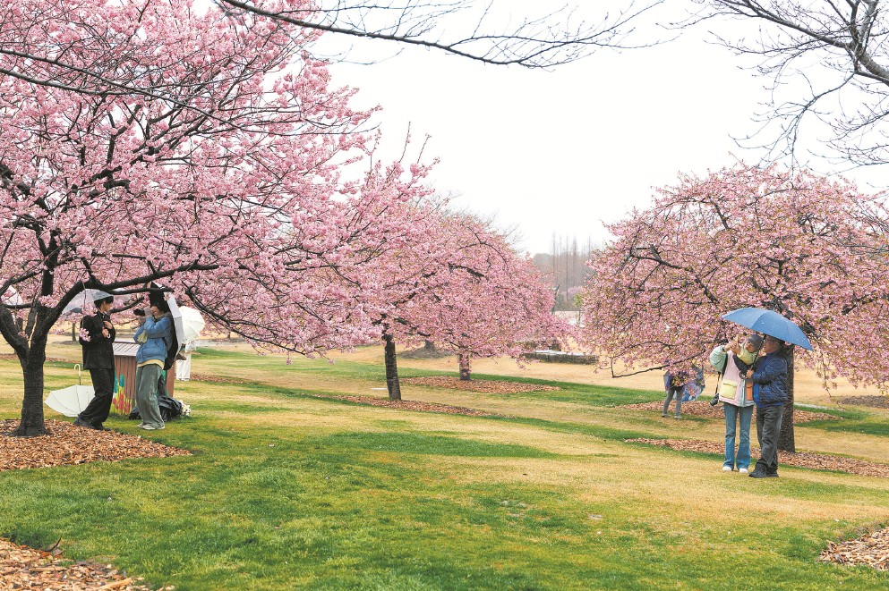 辰山植物园樱花近日进入最佳观赏期,不少游客冒雨前来拍照赏花。 本报记者 周俊超摄