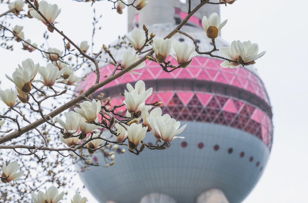 这个春天,上海各区因地制宜因花设节、设市集,消费活力汩汩迸发。图为陆家嘴明珠环岛边,玉兰花与东方明珠塔呼应。本报记者 袁婧摄 刊第二版