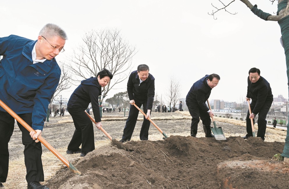 右图:陈吉宁、龚正、黄莉新、胡文容、朱忠明等市领导在杨浦区复兴岛岛北开放空间植树点参加全民义务植树活动。 陈正宝摄