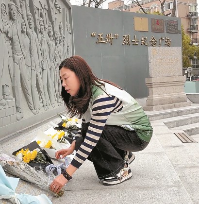 清明前夕,虹口区株洲路新同心路路口,“五卅”烈士纪念广场上已经摆了不少黄白菊花。李青蹲下身,把带来的白菊轻轻放在碑座旁,又将旁边的花束一一摆正。