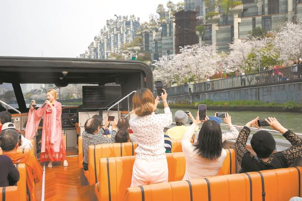 游客乘船,既可聆听船上的国风演唱,又能观赏两岸盛开的樱花 本报记者 周馨 摄