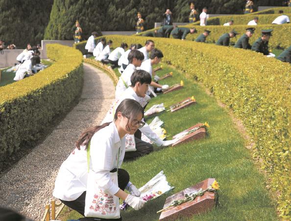 学生们擦拭烈士墓碑,敬献鲜花 本报记者 张龙 摄