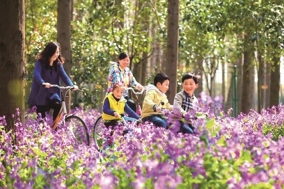 3月下旬,崇明花朝节主题游园活动中,游客骑车穿行在东平国家森林公园的二月兰中。 崇明区供图