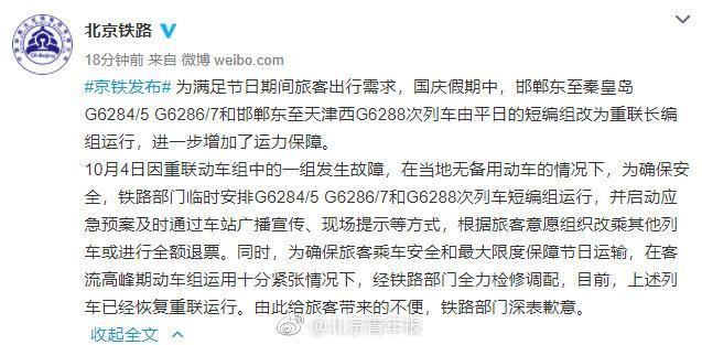 10月4日因重联动车组中的一组发生故障,在当地无备用动车的情况下,为确保安全,铁路部门临时安排G6284/5 G6286/7和G6288次列车短编组运行,并启动应急预案及时通过车站广播宣传、现场提示等方式,根据旅客意愿组织改乘其他列车或进行全额退票。同时,为确保旅客乘车安全和最大限度保障节日运输,在客流高峰期动车组运用十分紧张情况下,经铁路部门全力检修调配,目前,上述列车已经恢复重联运行。由此给旅客带来的不便,铁路部门深表歉意。
