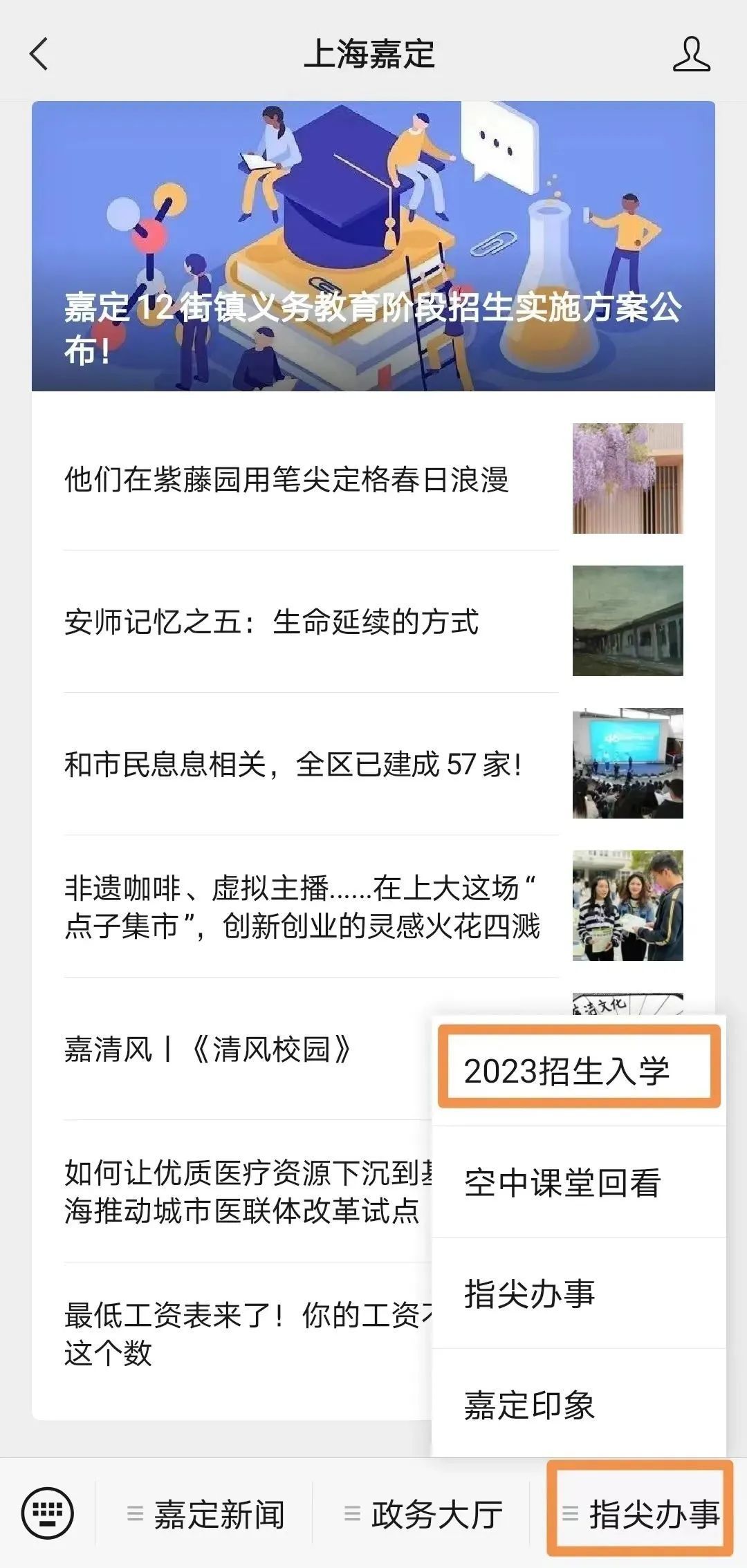 “指尖办事”-“2023招生入学”栏目查询