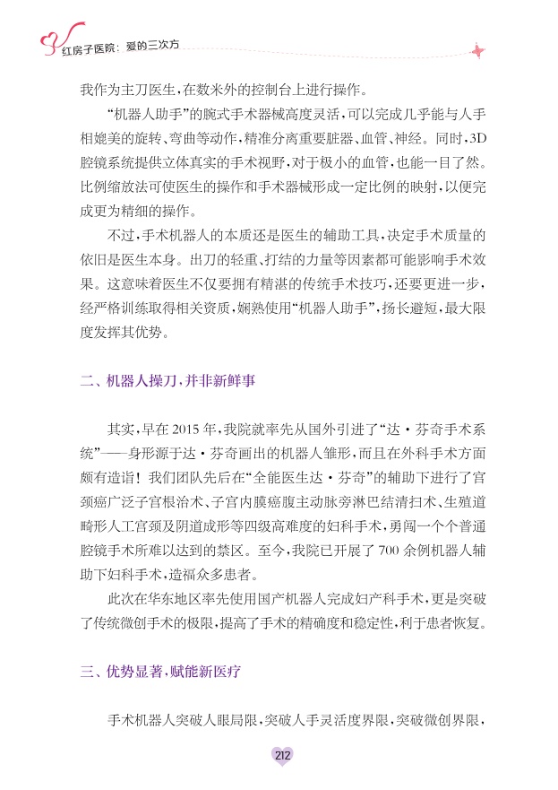 如今,红房子在妇科肿瘤诊疗效果的基础上,更增加了规范化、人性化的要求,通过微创手术、肿瘤切除的同时保留神经等技术,大大提高了肿瘤病人的生活质量。