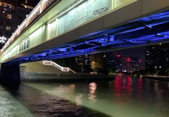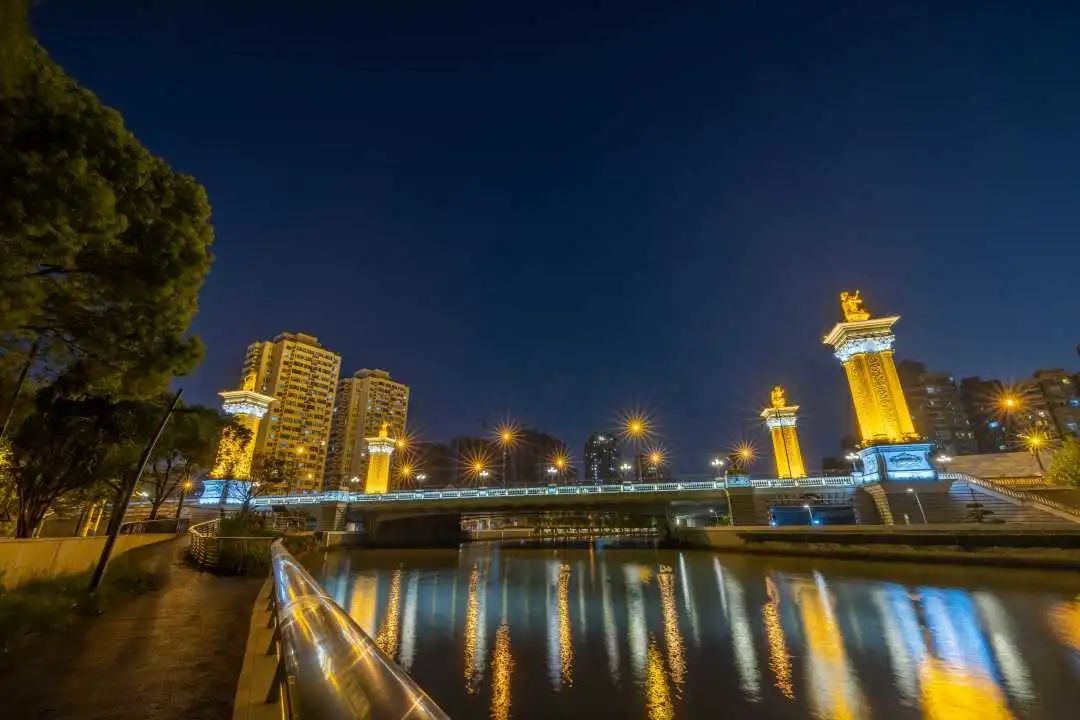 来到西康路桥,温润的洗墙灯,让桥身焕然一新,巧妙利用桥下空间,架设水波纹灯,将“桥腹”也提亮了起来。