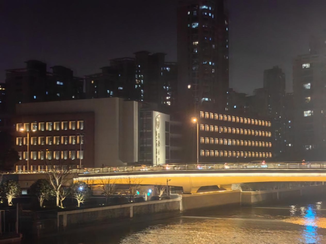 在镇坪路桥边,同济大学第二附属中学教学楼立面窗户被一一点亮,又是哪扇窗勾起了你对曾经学生时代的青春回忆?