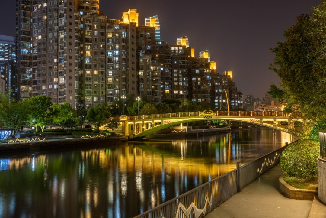 保持配速,穿过武宁路桥,来到谈家渡湾,此处毗邻上海知音苑、燕宁苑等大型社区,这些居民楼宇的夜景灯光近期经过优化,变得更加柔和,视野更加开阔。