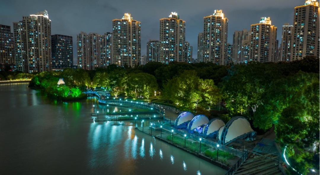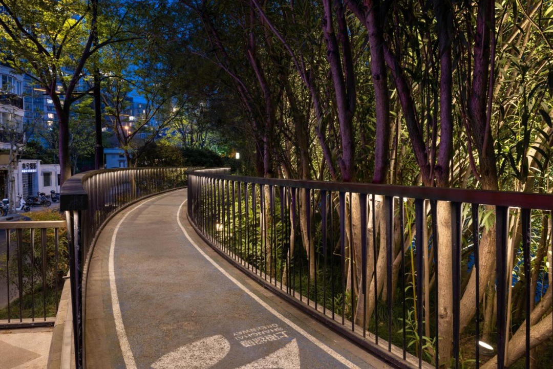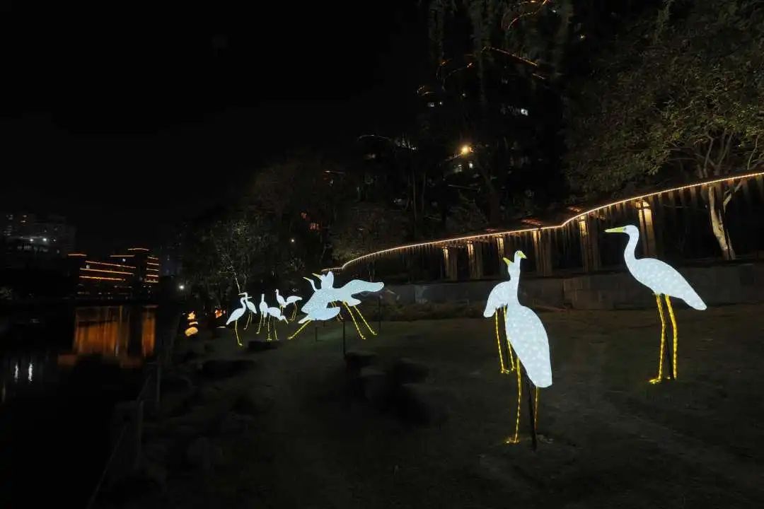 欣赏完绿映画屏,重新出发!接下来的路线充满了惊喜。咦,树梢间啥时悄悄“挂上”了那么多鸟巢?哦,原来那是鸟巢形照树灯,它们将岸线整体提亮补暗的同时兼顾了生态和环保,真是个不错的点子!