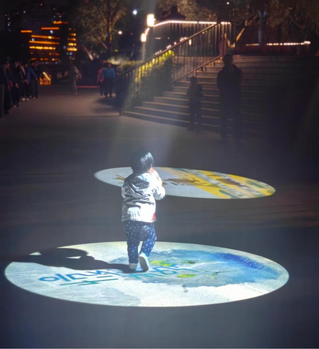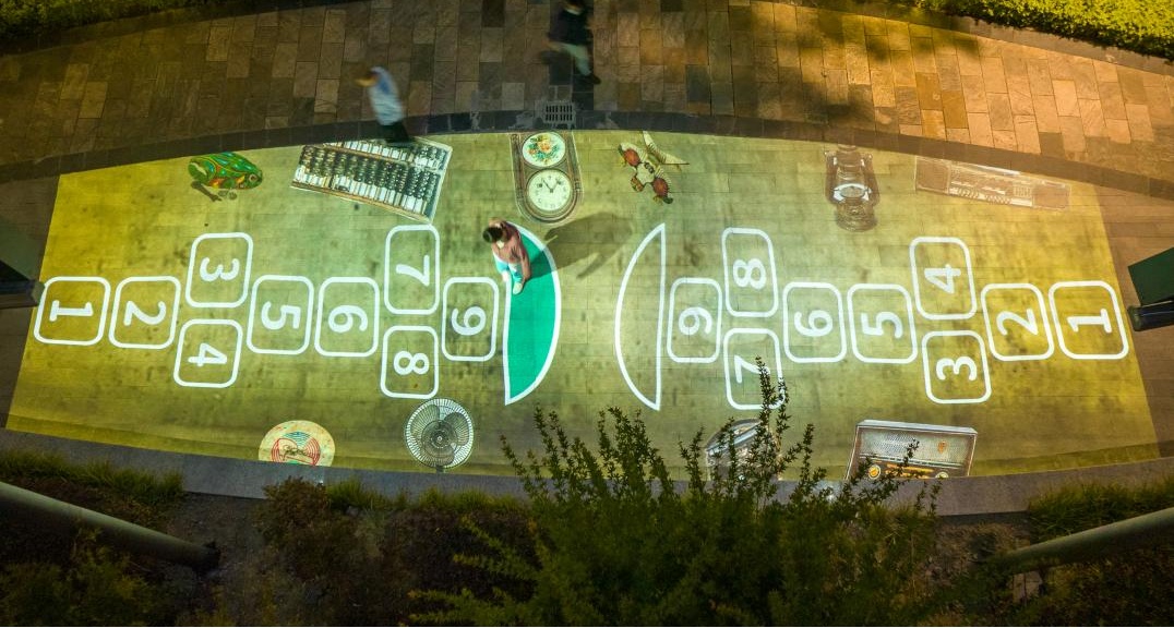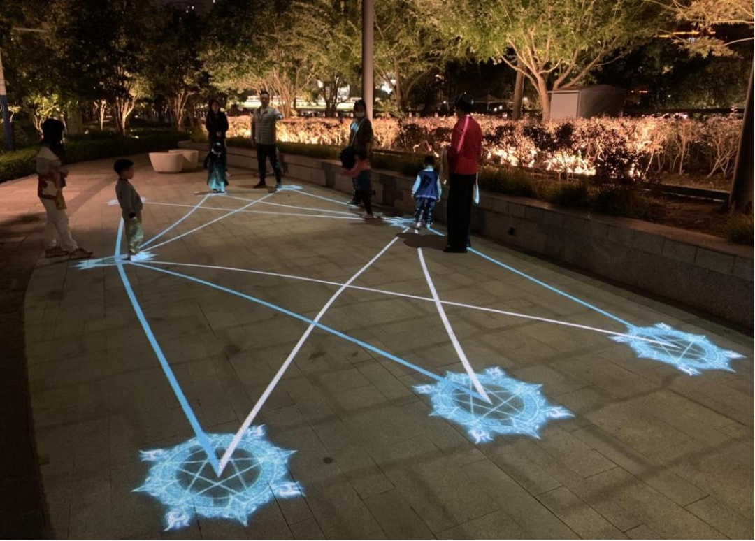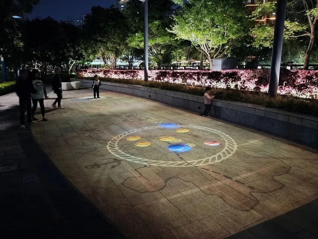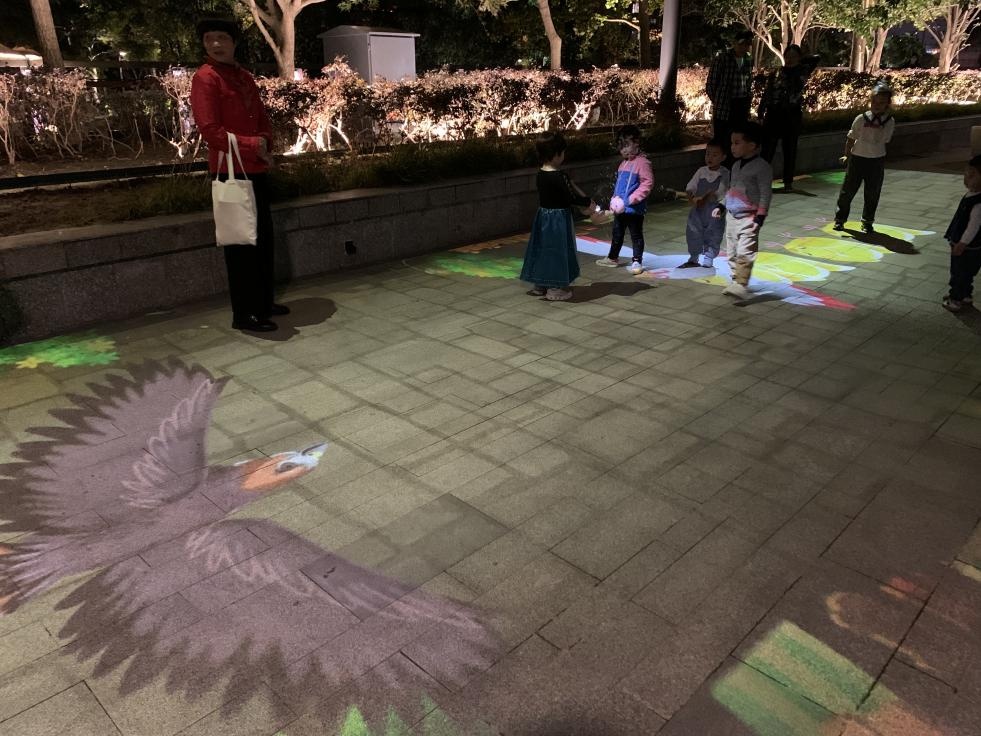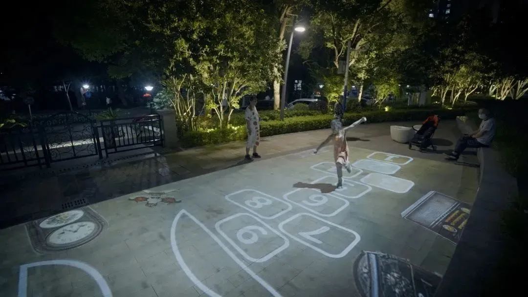 再向前,来到的便是“童年回忆”互动投影节点,充满童年回忆的“跳房子”“滚铁环”“老鹰捉小鸡”等7种互动投影游戏,吸引着大小朋友们在方格上欢快地跳跃。小朋友们的脚步“发出”清脆的铃声和多彩的光芒,“大孩子们”则重温着童年的回忆,真正让光影与人产生共鸣,你也可以停下来,参与这“沉浸式”的跳跃!