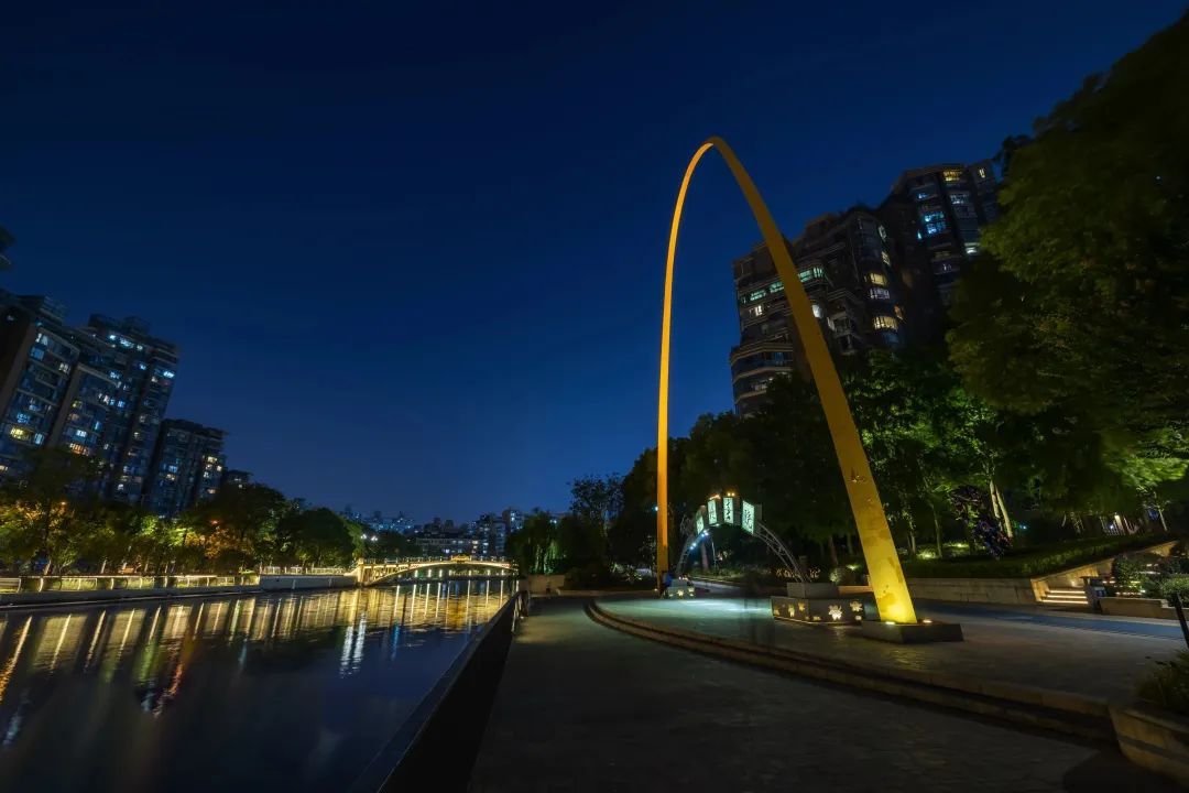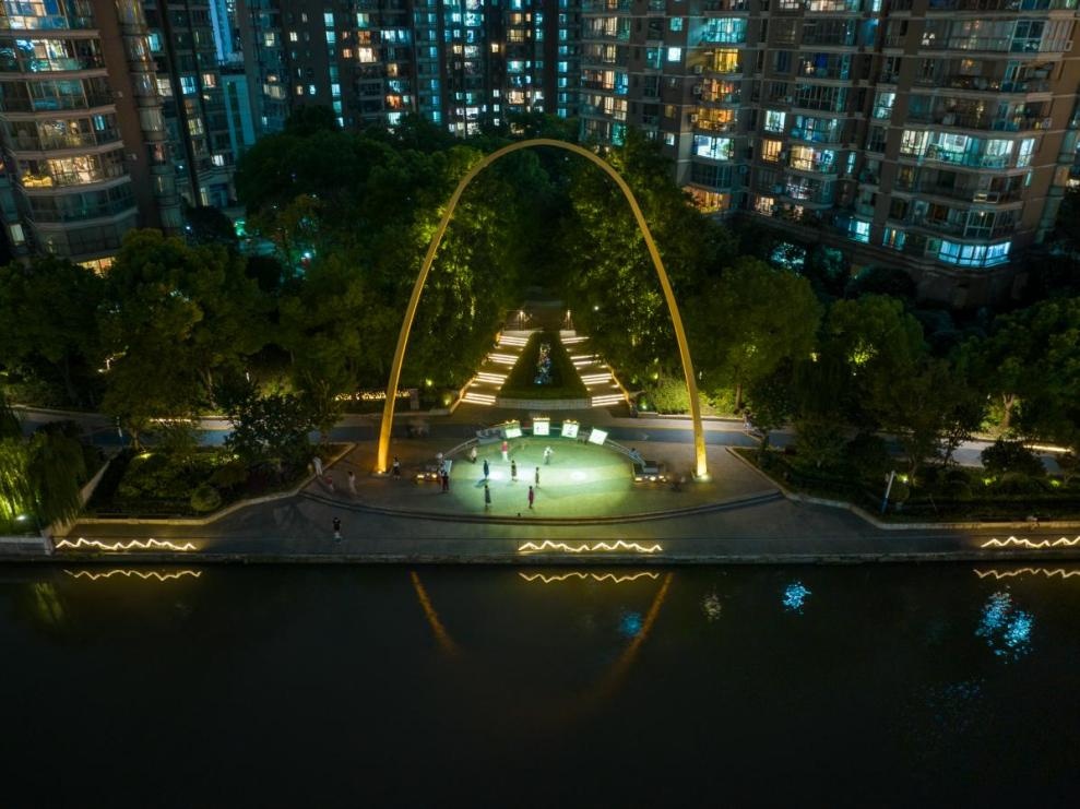 苏堤春晓小区边,暖色投光灯精确地勾勒出拱形门充满张力的曲线,给人们带来向上的活力,这里不要停下脚步,在金色“拱门”下尽情欢跳。