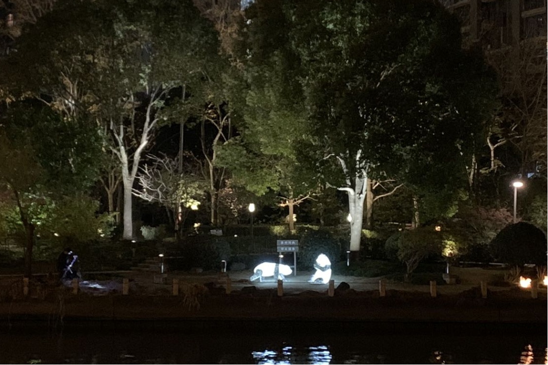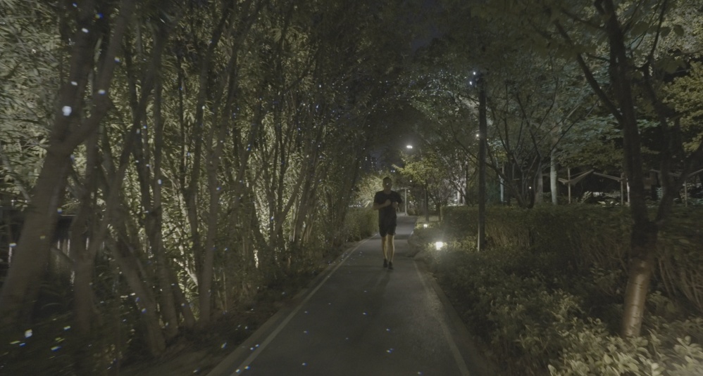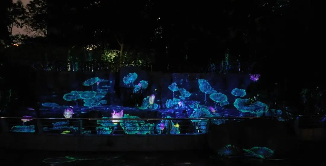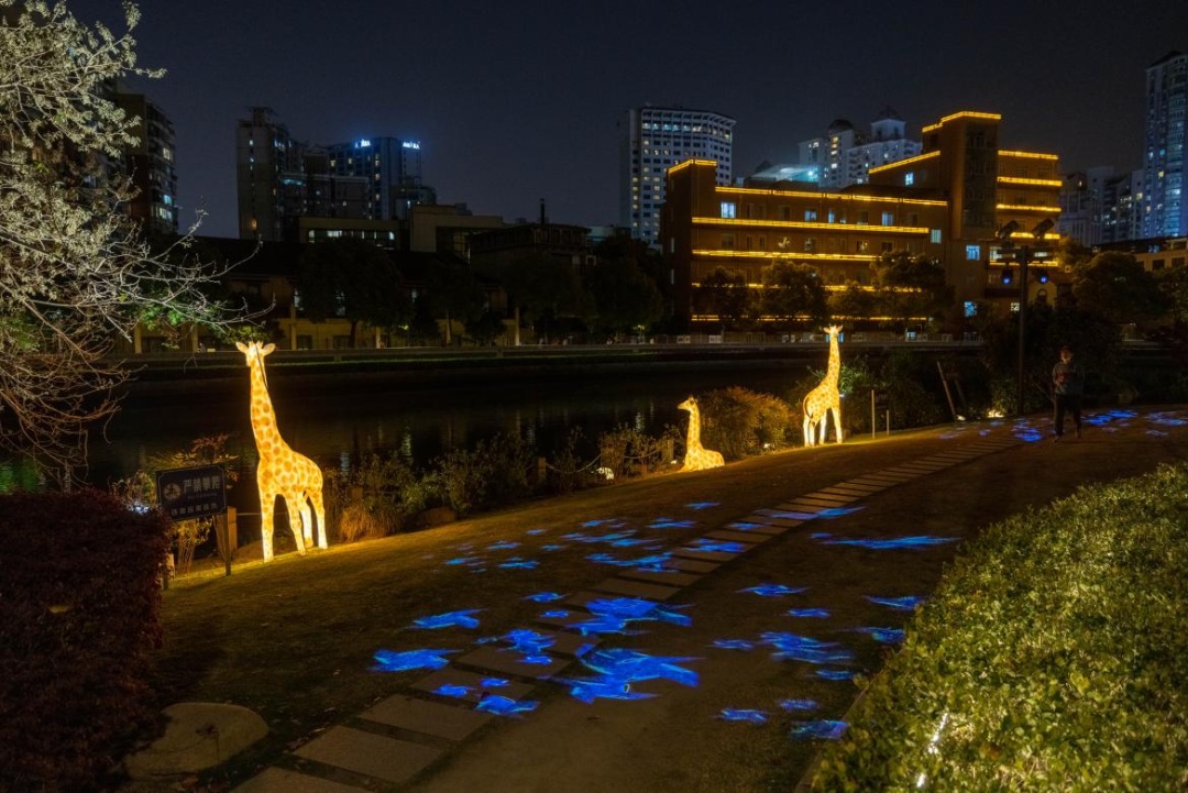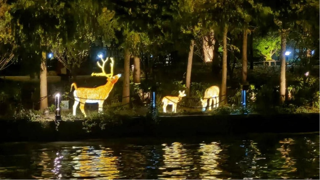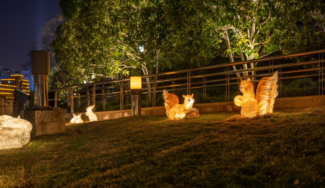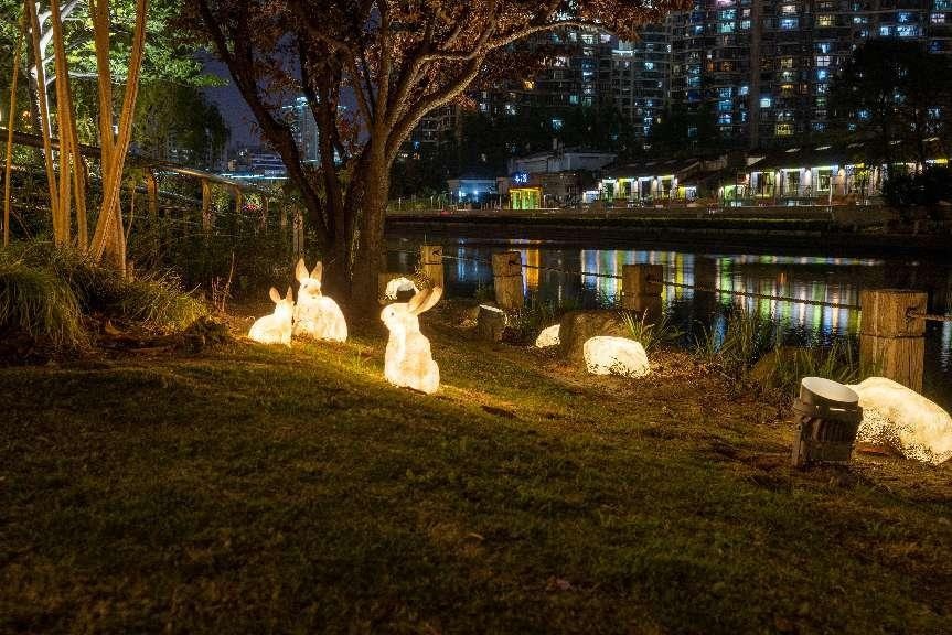 一边跑,一边探索,看,在绿丛掩映中,在岸边乱石间,隐藏着许多小惊喜,白天憨态可掬的“小动物们”到了晚上又是另一派生机,它们活灵活现,在夜色下焕发出神奇的生命力。
