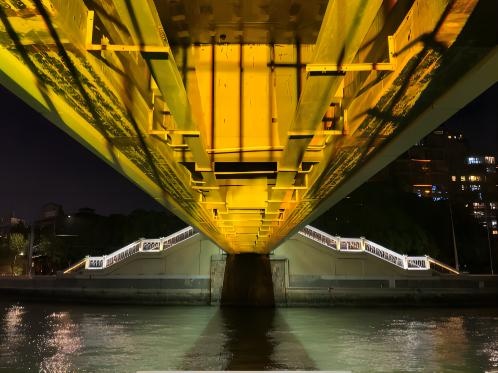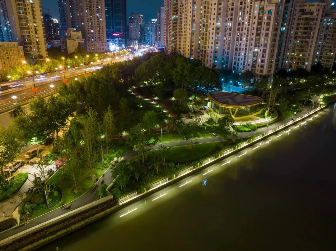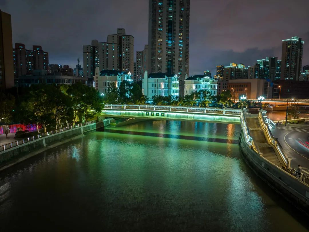 终于来到古北路桥,可以放慢脚步,歇一歇了,这里岸线骤然开阔许多,苏州河普陀段最大的滨水空间——半马苏河公园的夜晚等着你来探索。
