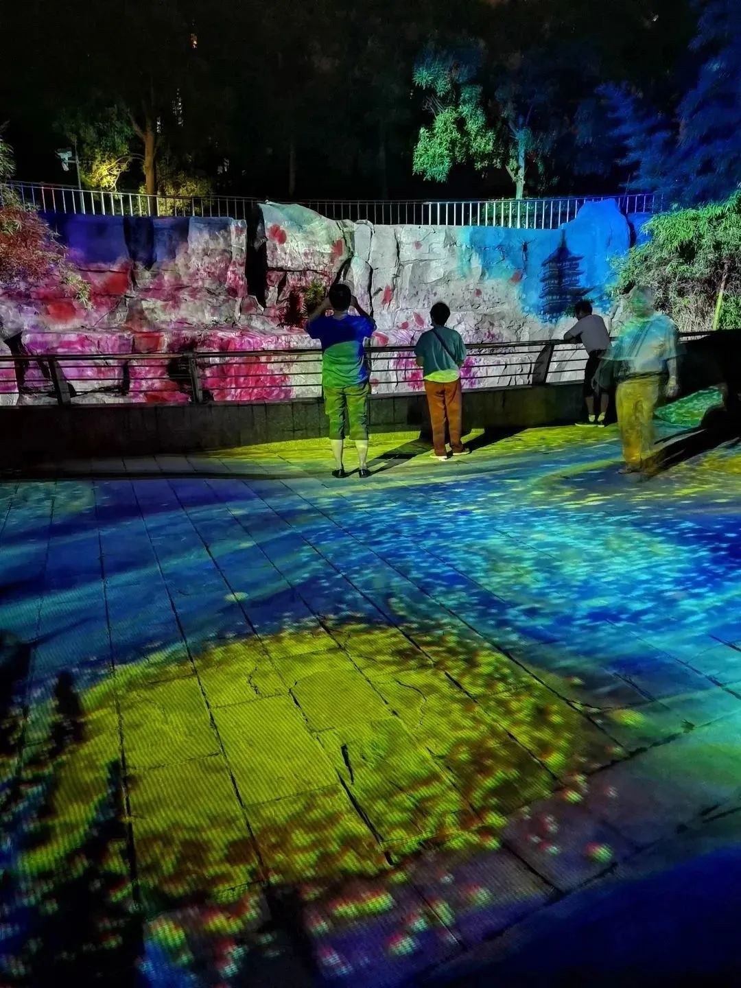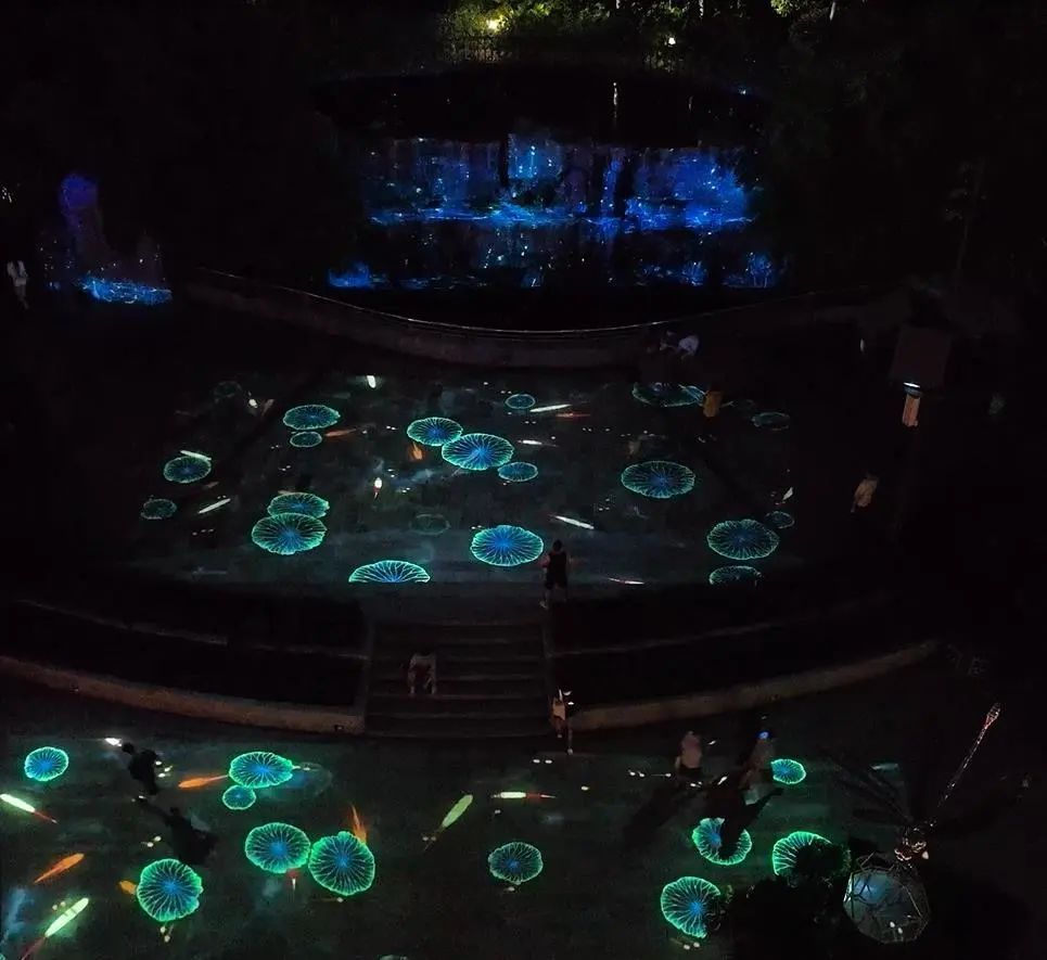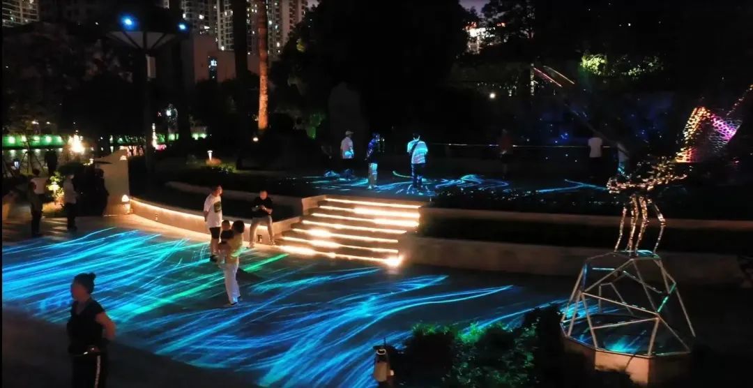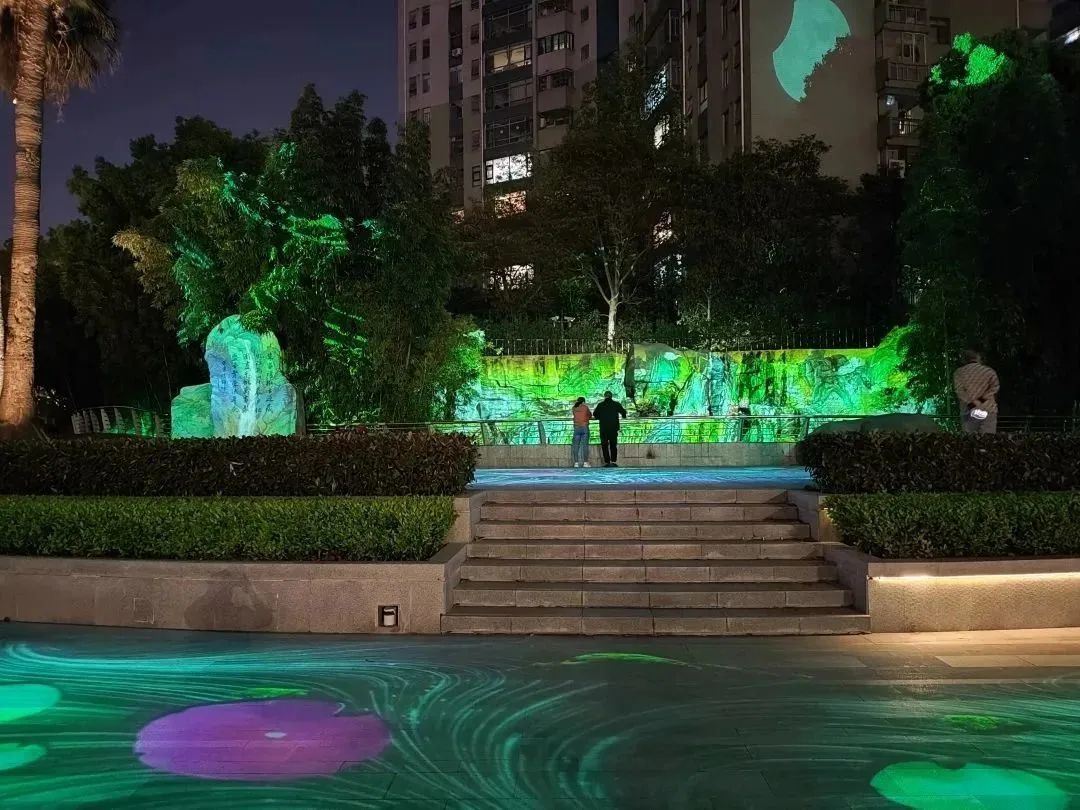 跑过消防塔100余米,忽见半岛花园小区边亲水平台的光影空间宛如屏扇徐徐展开,在这里,你一定会小憩片刻。看,一时流水潺潺、绿树生长、鲜花绽放;一时挥舞的水袖演绎着动人的故事;一时地面仿佛又融化成碧波池塘,赤色鲤鱼纷纷游走,泛起涟漪,与你交相互动,大家都驻足盼望着画屏亮起的那一刻。