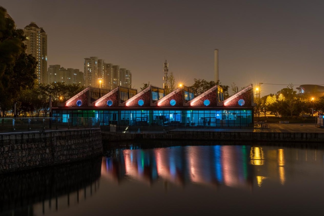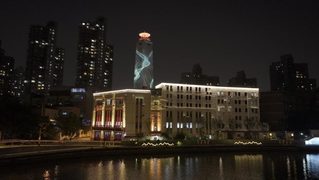 下了古北路桥,来到半马苏河公园1号公园,便看到普陀区青少年教育活动中心(原上海火柴厂旧址)建筑在全新的灯光呼应下,使得富有历史底蕴的特色造型又多了一份魅力。