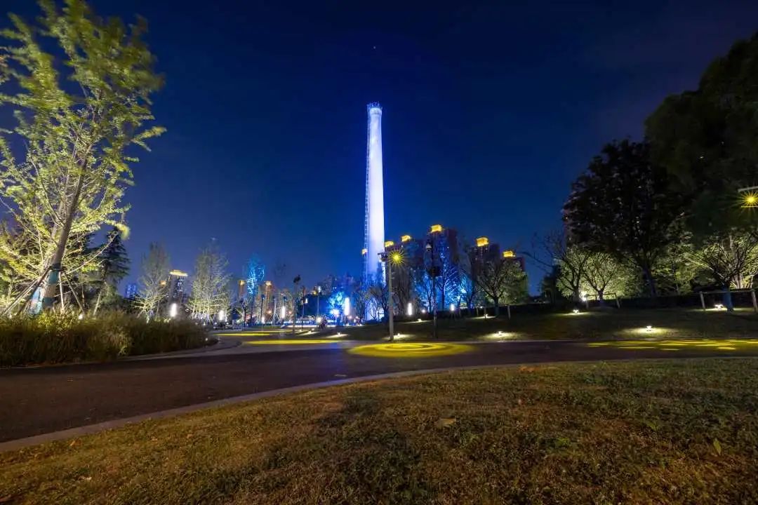 在半马苏河公园里继续向西,原上海试剂总厂62米高的烟囱如今“披上”了动态光影,继续述说着苏州河沿岸时代的历史记忆。