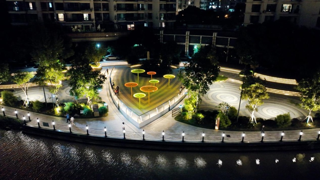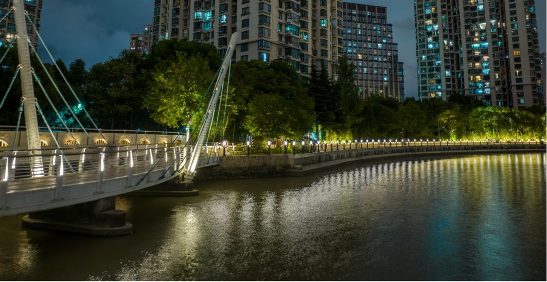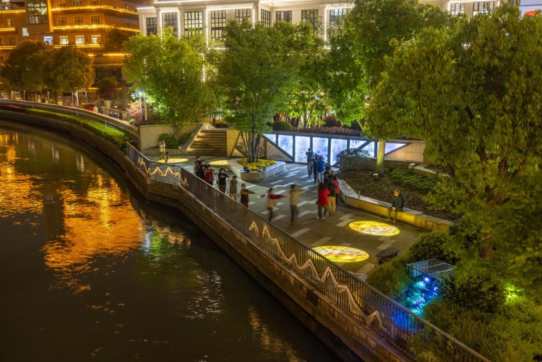 原来色彩凌乱的岸线栏杆灯全部更新成了暖色光,并适度补充暖色照树灯,让沿河光影凸显柔和与内敛,将“静雅”留给来往的游人。